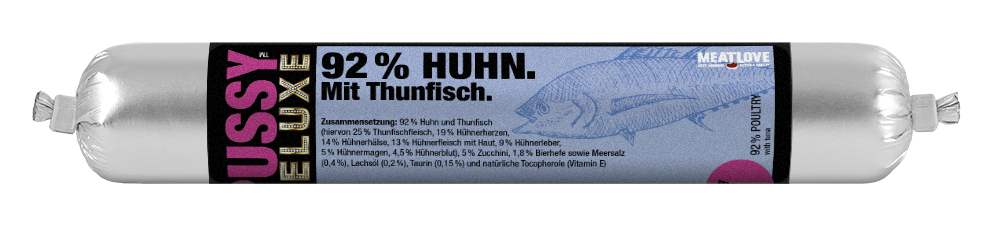 92% Huhn und Thunfisch (hiervon 25% Thunfischfleisch, 19% Hühnerherzen, 13% Hühnerfleisch mit Haut, 14% Hühnerhälse,