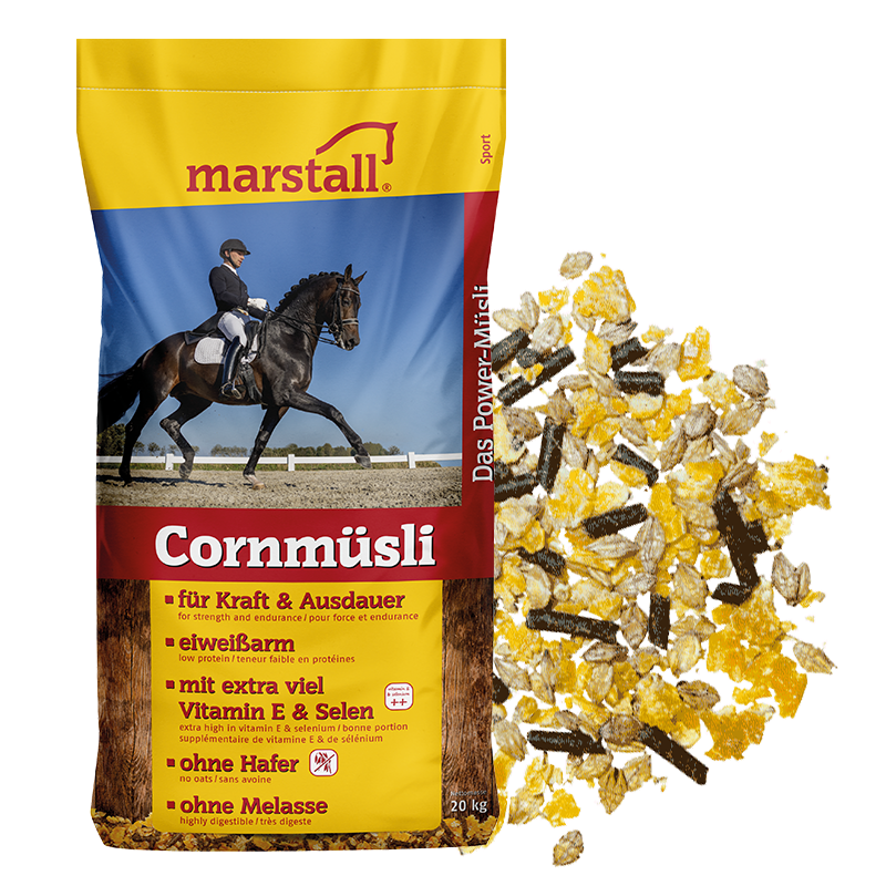 marstall Cornmüsli ist ideal als alleiniges Ergänzungsfutter zu Heu, kann aber auch mit Hafer, Pellets oder anderen Müsli-Mischungen wie Hafer-Mix, Getreidefrei-Mix oder Naturell-Mix kombiniert werden. Dabei richtet sich der Anteil an marstall Cornmüsli nach dem individuellen Energiebedarf und der Belastung des Pferdes.