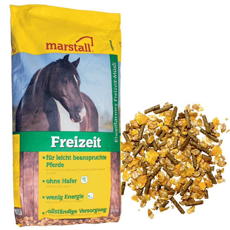marstall Freizeit ist ein kostengünstiges, universell einsetzbares Müsli, das auf hydrothermisch aufgeschlossenen und damit leicht verdaulichen Getreideflocken basiert. Sein niedriger Energie- und Eiweißgehalt und der hohe Anteil an Rohfaser sind ideal für die bedarfsgerechte Fütterung gering beanspruchter Pferde. Alle wichtigen Vitamine, Mineralien und Spurenelemente sind enthalten und optimal auf die Bedürfnisse von Freizeitpferden abgestimmt.