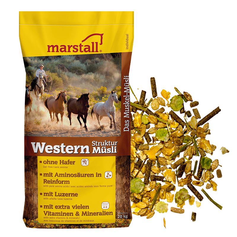 marstall Western Struktur-Müsli ist durch die Zugabe essenzieller Aminosäuren speziell auf die Bedürfnisse von muskelbetonten Rassen abgestimmt. Leicht verdauliche Kohlenhydrate aus hydrothermisch aufgeschlossenen Mais- und Gerstenflocken geben die nötige Power. Die Antioxidantien Vitamin E und Selen helfen dem Organismus dabei, freie Radikale zu reduzieren, und schützen somit die Muskelzellen.